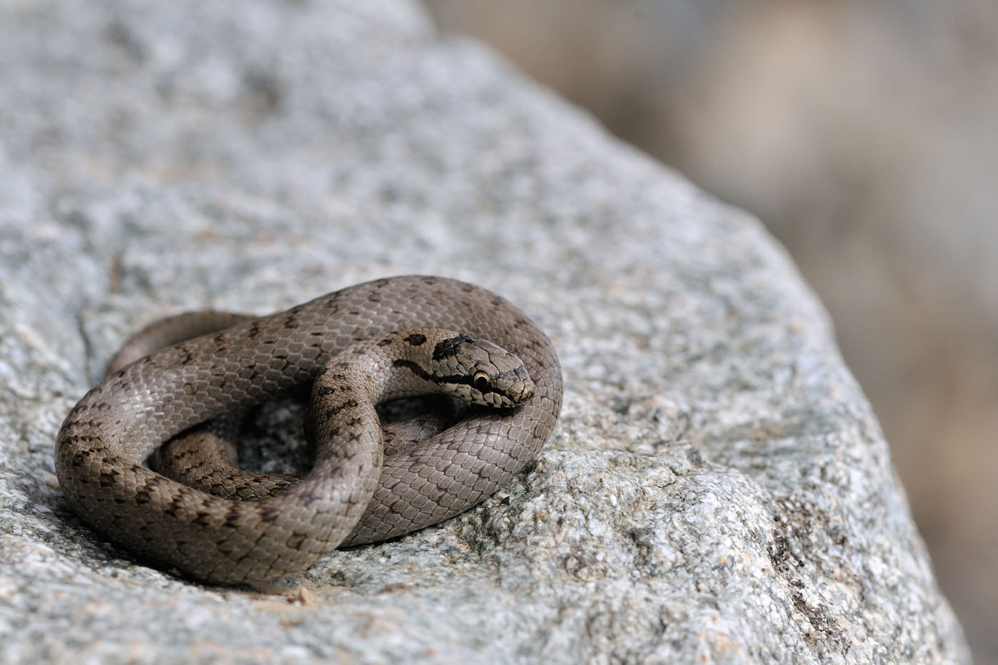 Cette écaillure correspondrait à celle dite" normale" de la  couleuvre vipérine mais ce  qui me gêne un peu c'est la rostrale bien visible qui remonte donc je dirais une coronelle lisse atypique pour les dessins et la couleur de la tête car des cas de mélanisme ont été signalés ( cité par Jacques Fretey ) :? . . . .