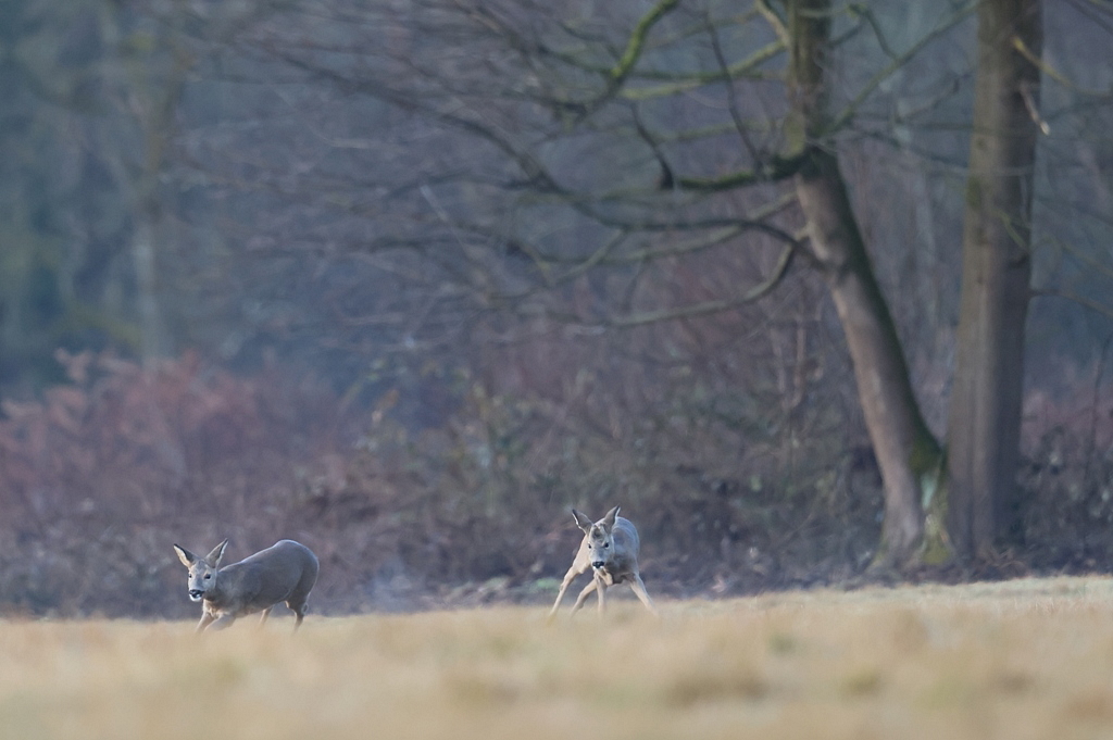 Puis, tout à coup les deux chevreuils se mettent à courir dans tous les sens, se poursuivent, sautent, tournent en rond, se frôlent, se toisent.