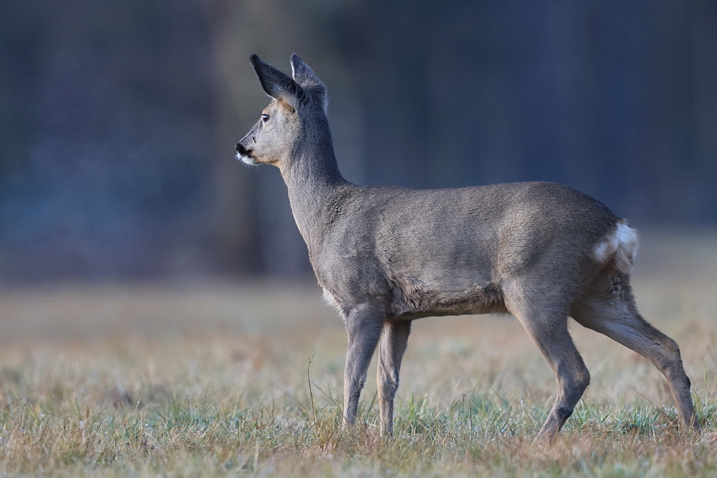 Un chevreuil et un brocard sont tout au fond de la prairie.