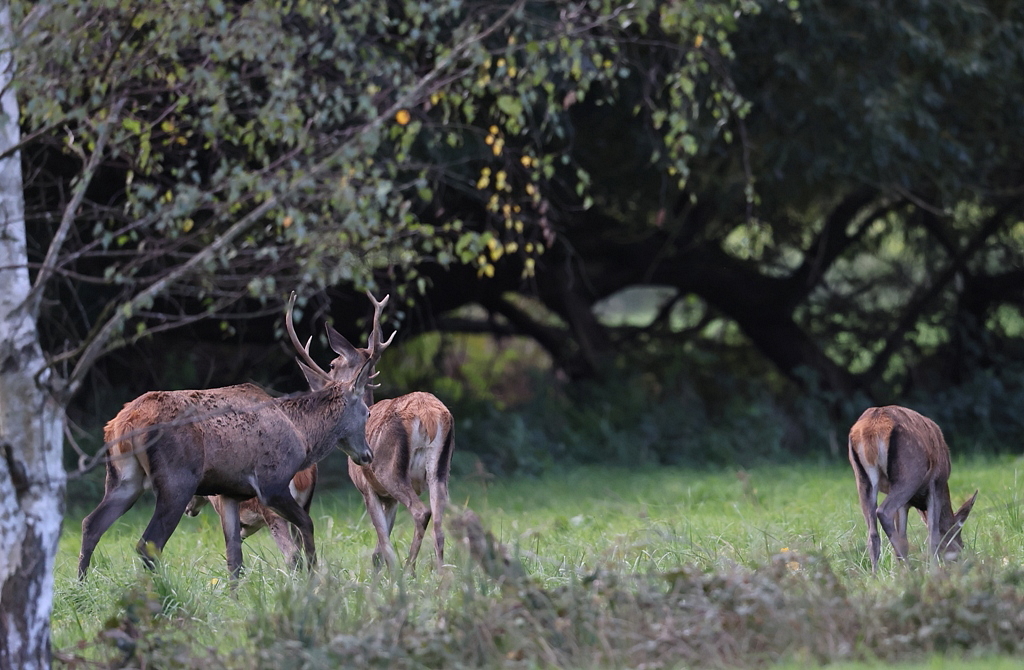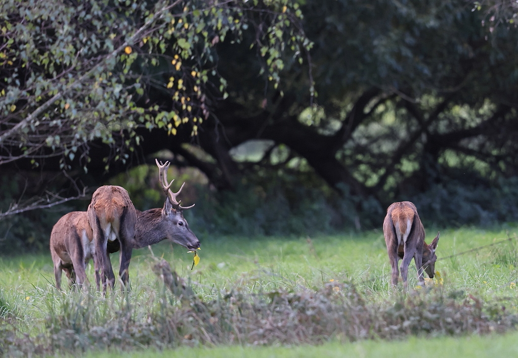 Tout au fond de la prairie, je vois avec les jumelles, 1 Cerf et 2 Biches qui broutent.
