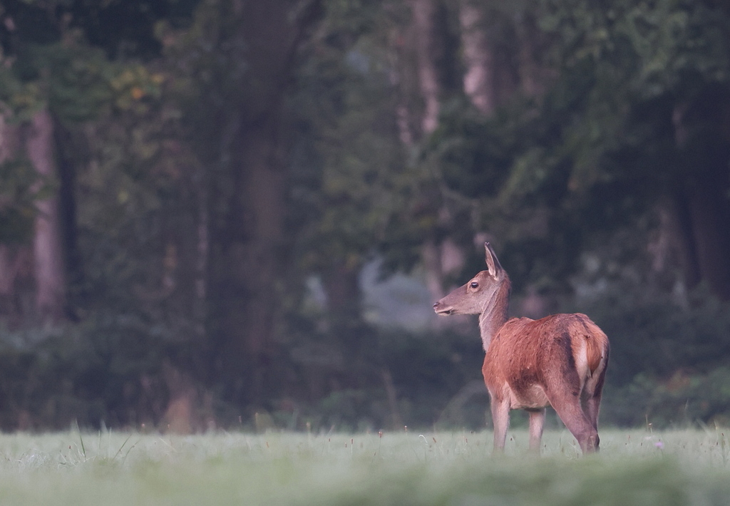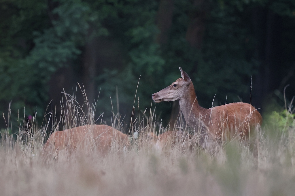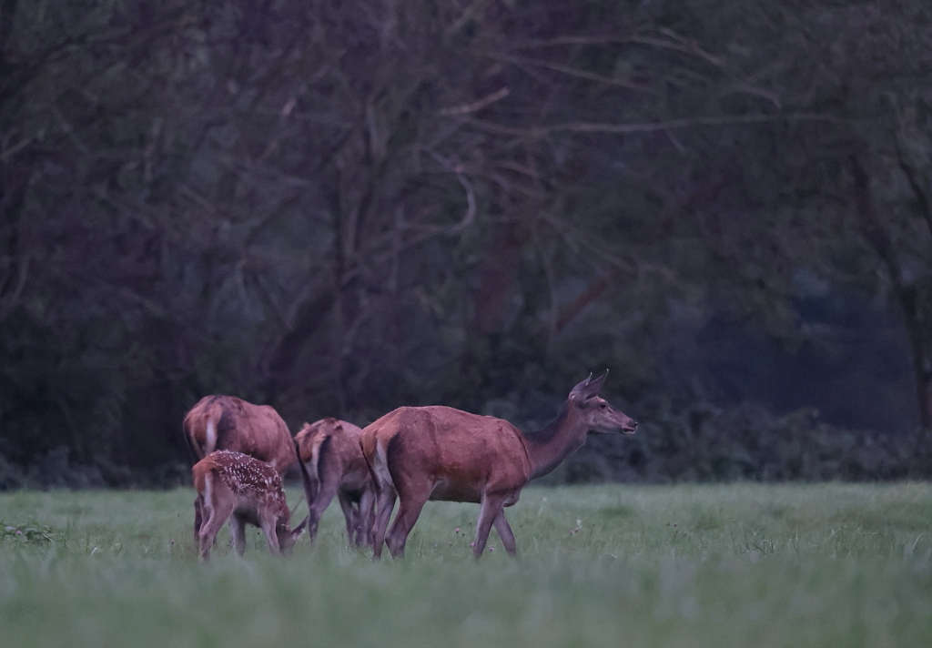 Début août en photographiant un Héron au petit matin dans une prairie, j'aperçois 3 Biches broutant au loin.