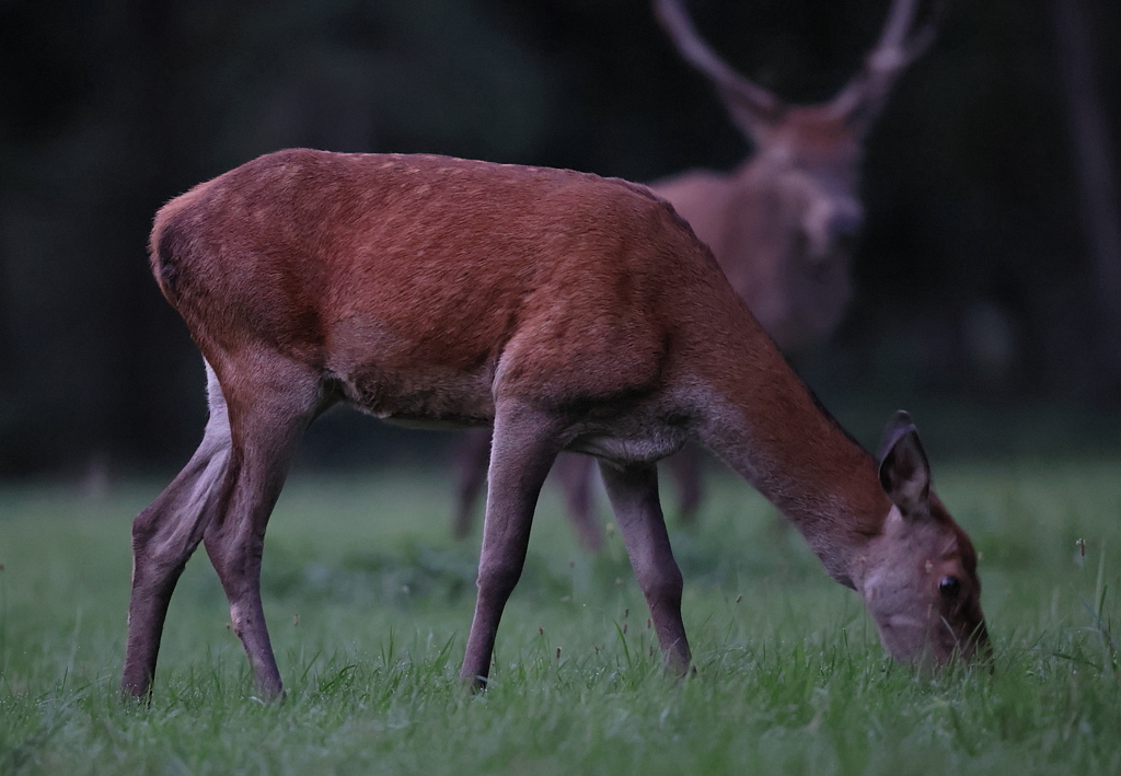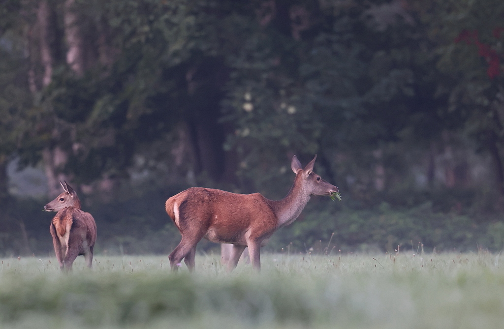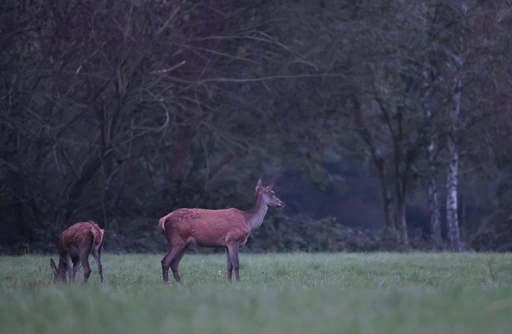 Suivent 2 Biches qui s'avancent jusqu'au milieu de la prairie en broutant de-ci de-là.