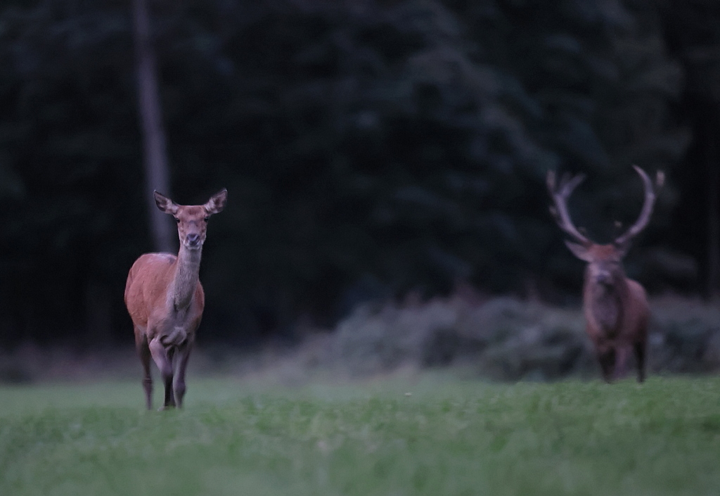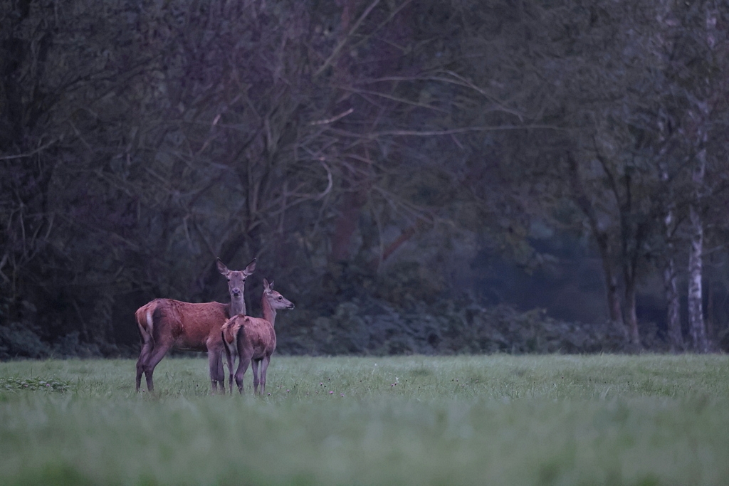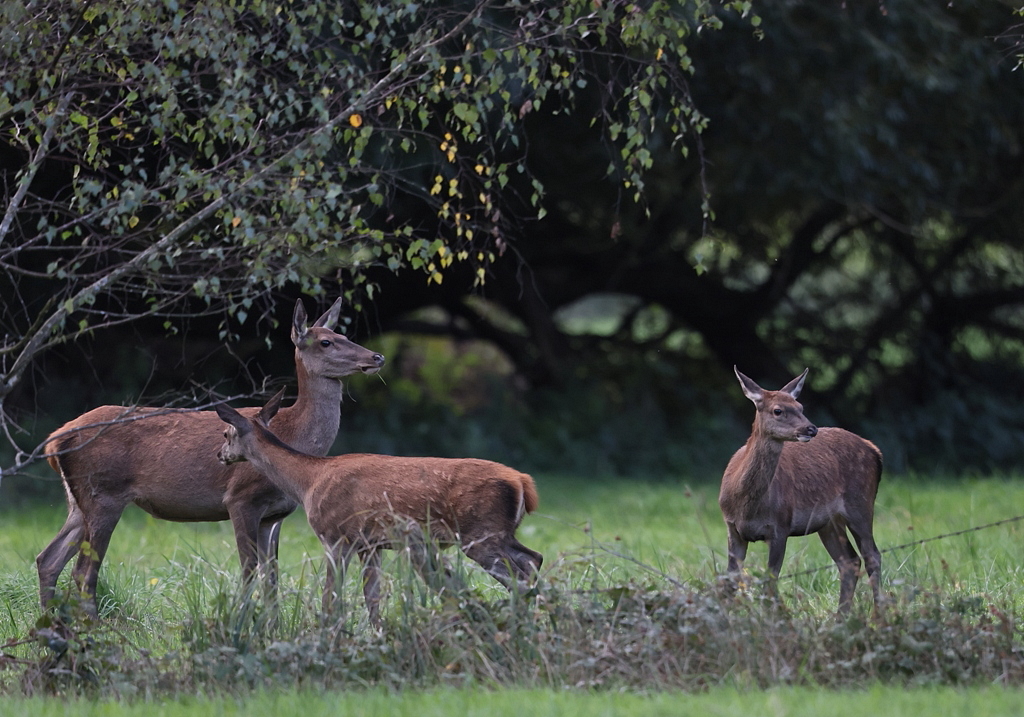 Il fait trop sombre pour les identifier précisément, mais il s'agit de 1 Cerf et 2 Biches.