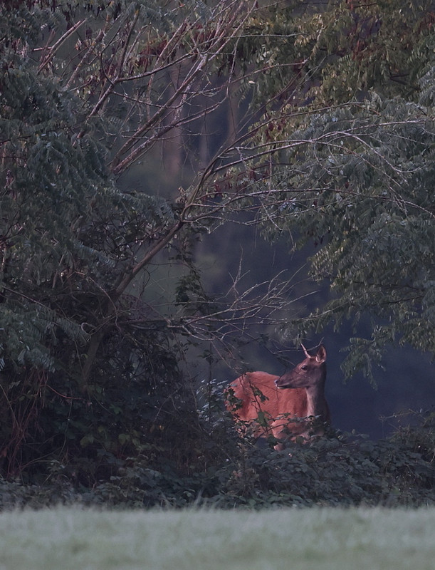 Lors de certaines sorties j'ai pu observer avec les jumelles, de nuit, des Biches et des Cerfs dans la prairie et plusieurs matins on entendait des Cerfs bramer dans les prairies voisines, mais pas très fort, surement fatigués de la nuit.