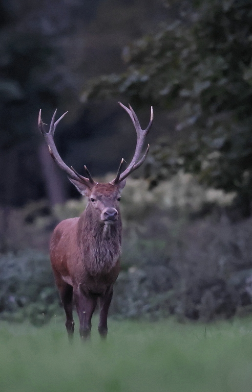 C'est un grand Cerf, qui me parait imposant, haut sur de longues pattes très sombres, avec un épais coup orné d'une volumineuse crinière sombre. Ses bois sont quasiment noir, avec les extrémités très claires.