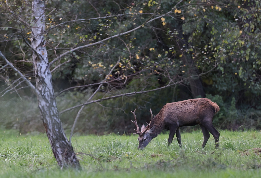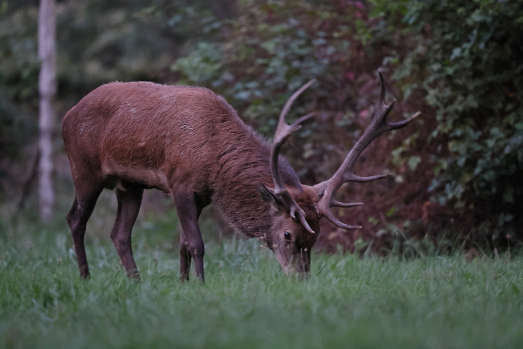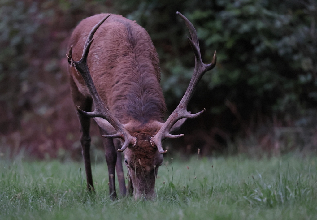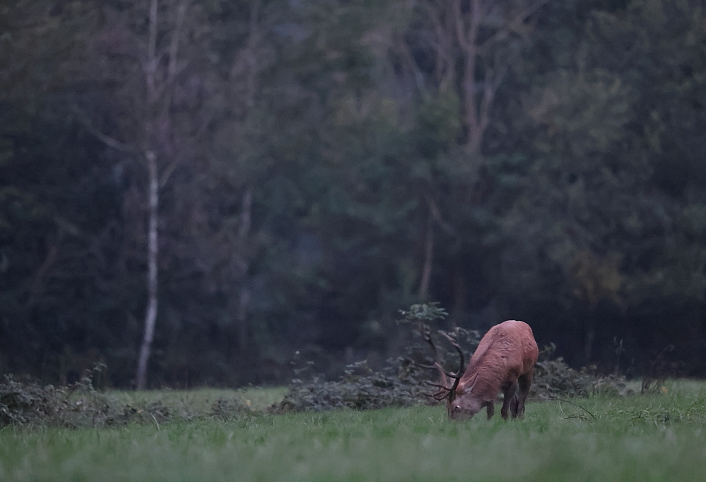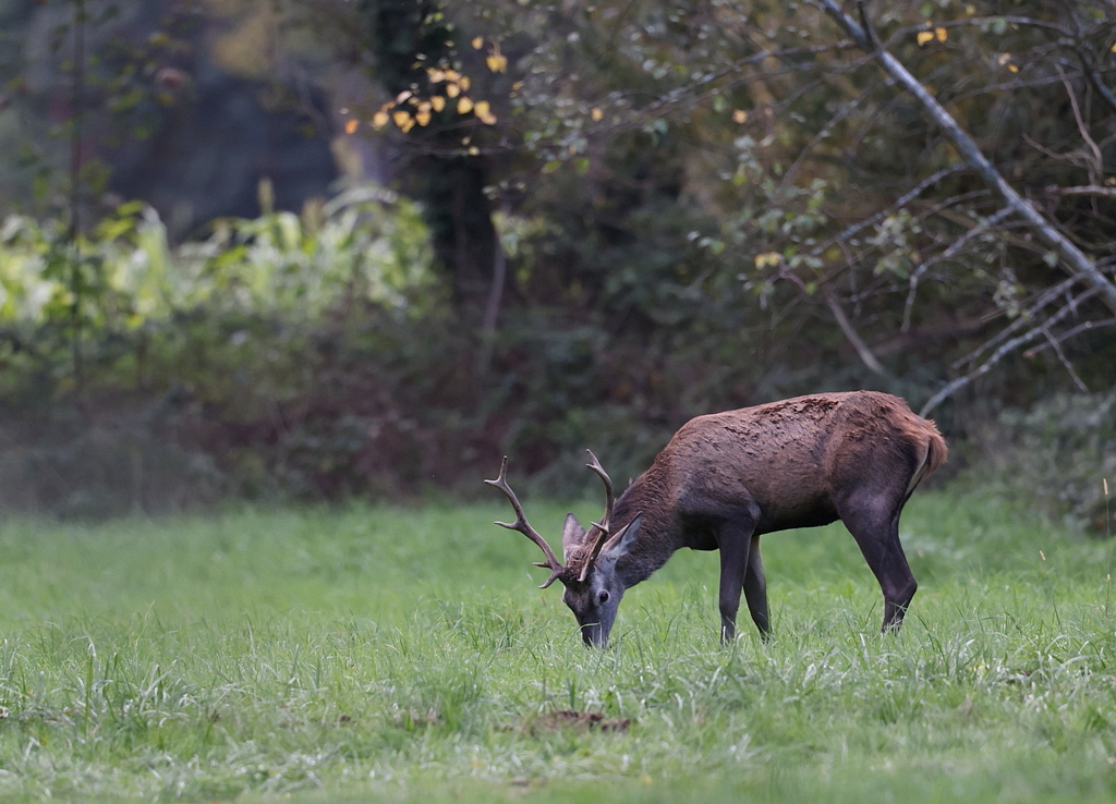 Bon, quand le Cerf baisse la tête pour brouter, il passe à nouveau dans le cadre et j'ai au moins ses magnifiques bois plein cadre.