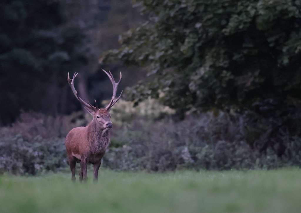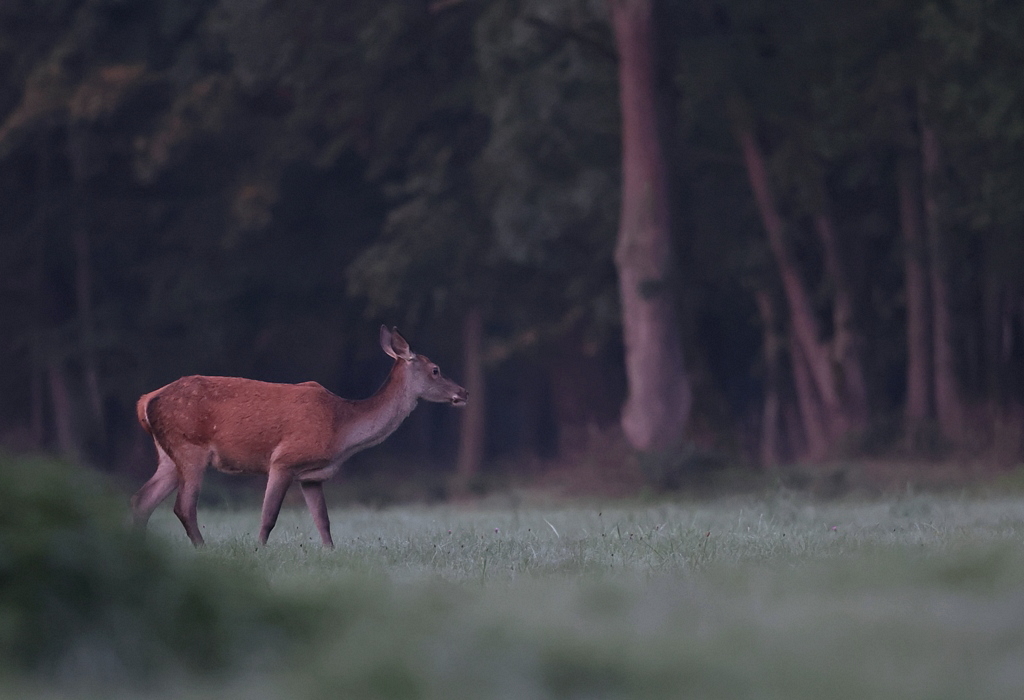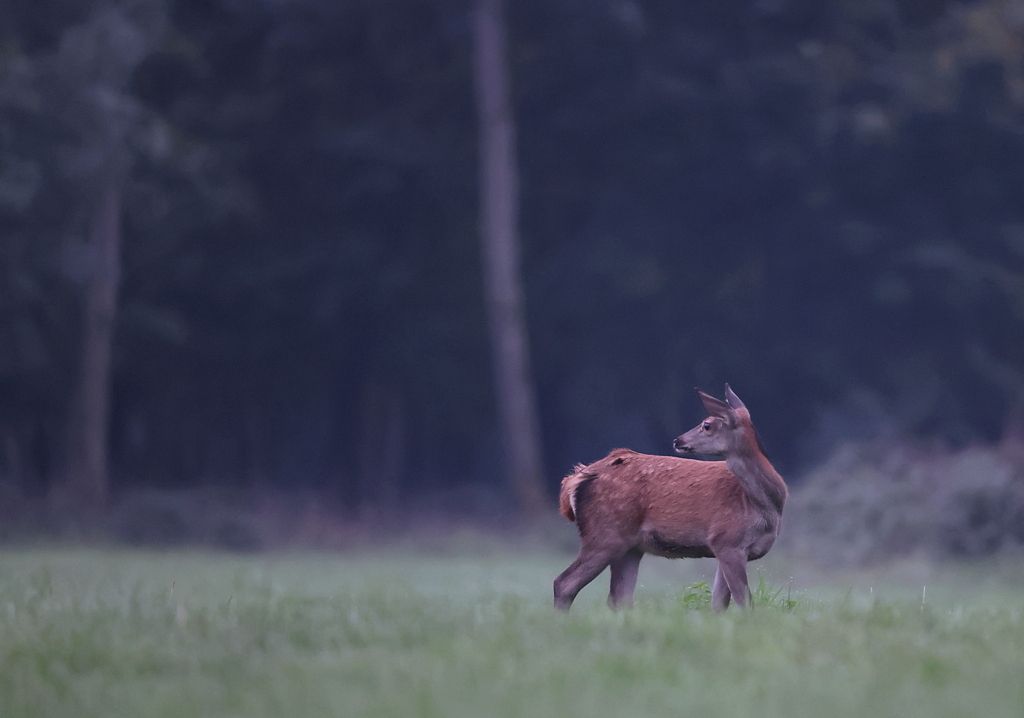 A 6h45, le jour se lève progressivement et voilà qu'arrive, au fond de la prairie, tout doucement, un Cerf.