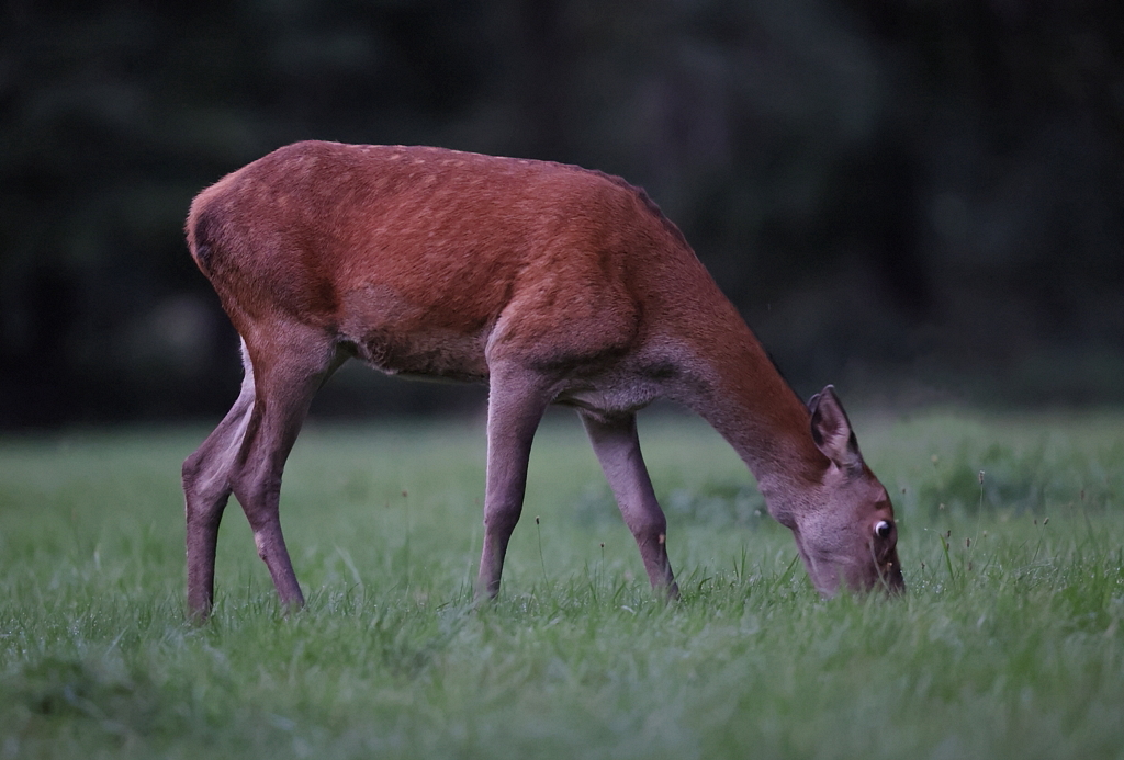 Une des Biches fixe longuement mon affût, mais comme je ne bouge pas du tout, elle se remet à brouter devant moi.