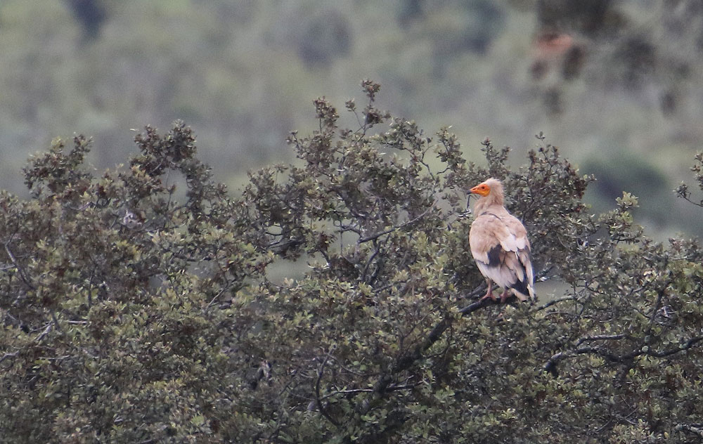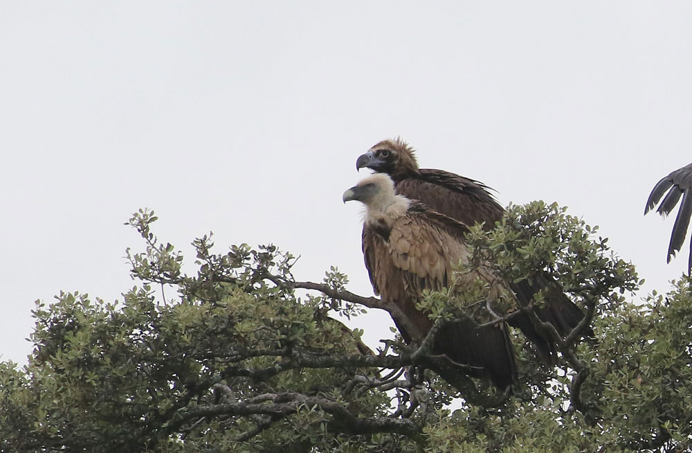 moment rare : ce matin-là, les vautours sont sur les arbres d'une prairie; le soleil n'est pas encore là